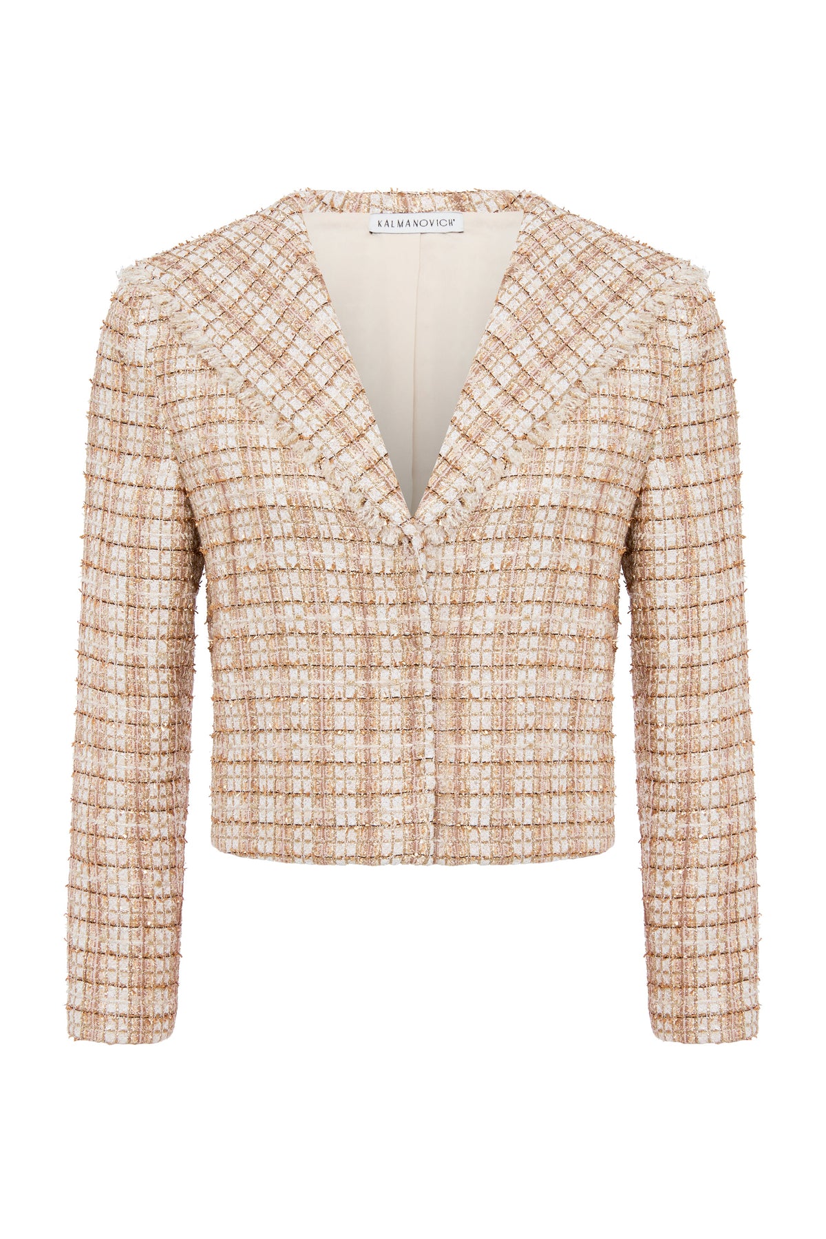 Cropped jacket with a sailor-style collar crafted from tweed produced by the French mill Jules Tournier – the one of the oldest in Europe.