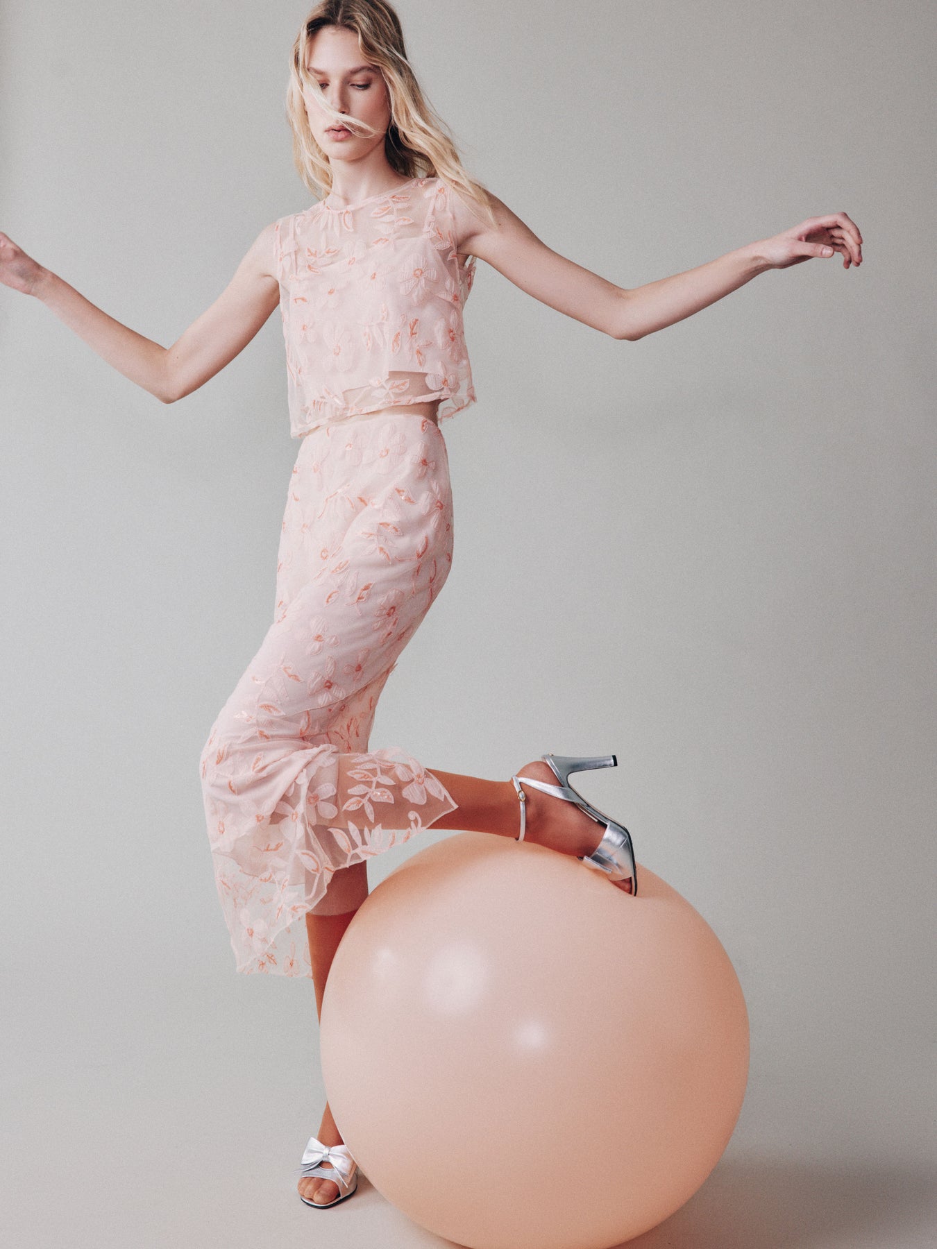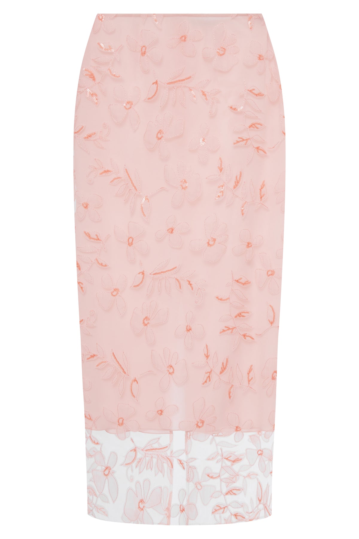 Midi skirt with a back slit, crafted from fabric embellished with floral appliqués and sequins. The inner skirt is made from crepe.
