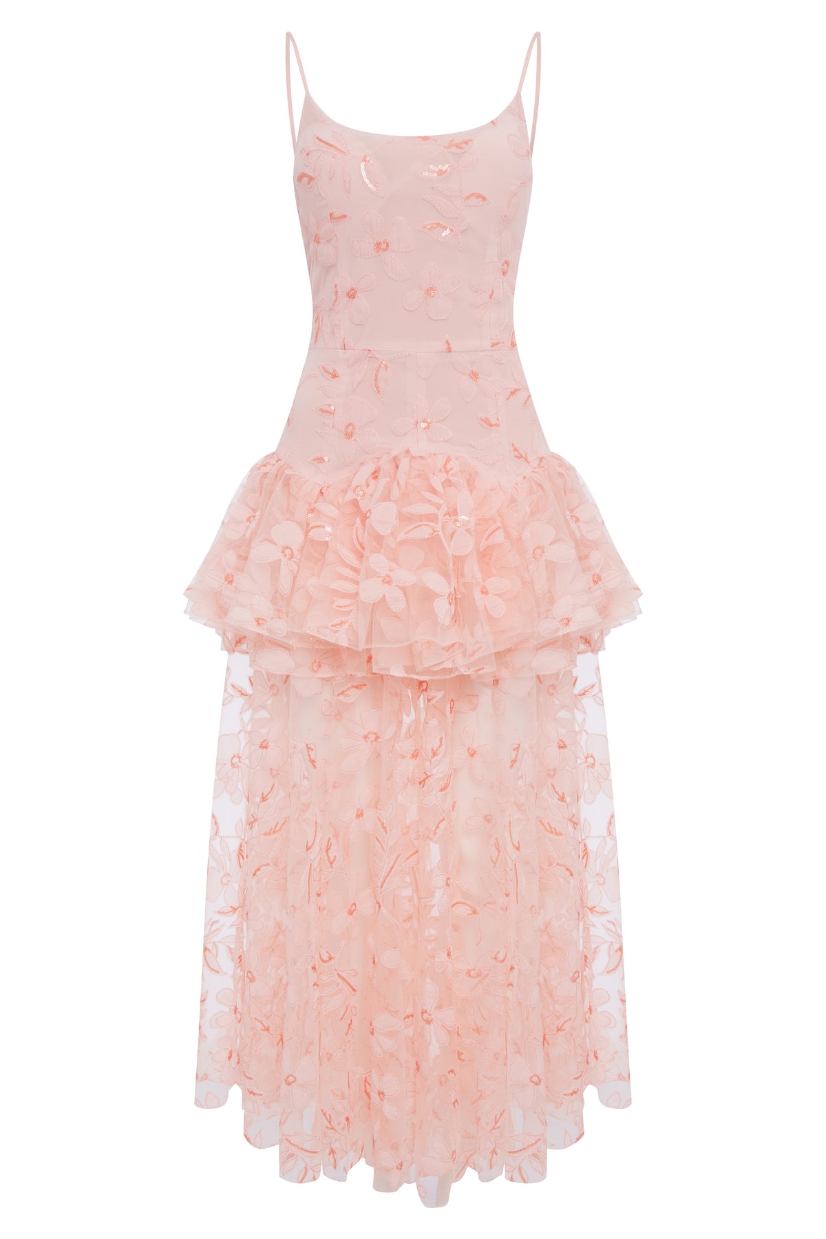 Strappy dress with a ruffled detail, crafted from fabric embellished with floral appliqués and sequins. Partially lined with crepe.