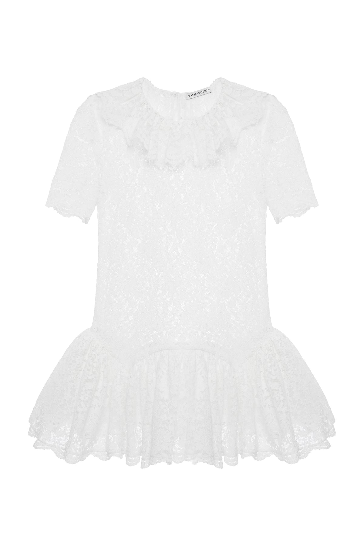 Lace mini dress with a jabot collar and a voluminous ruffle.
