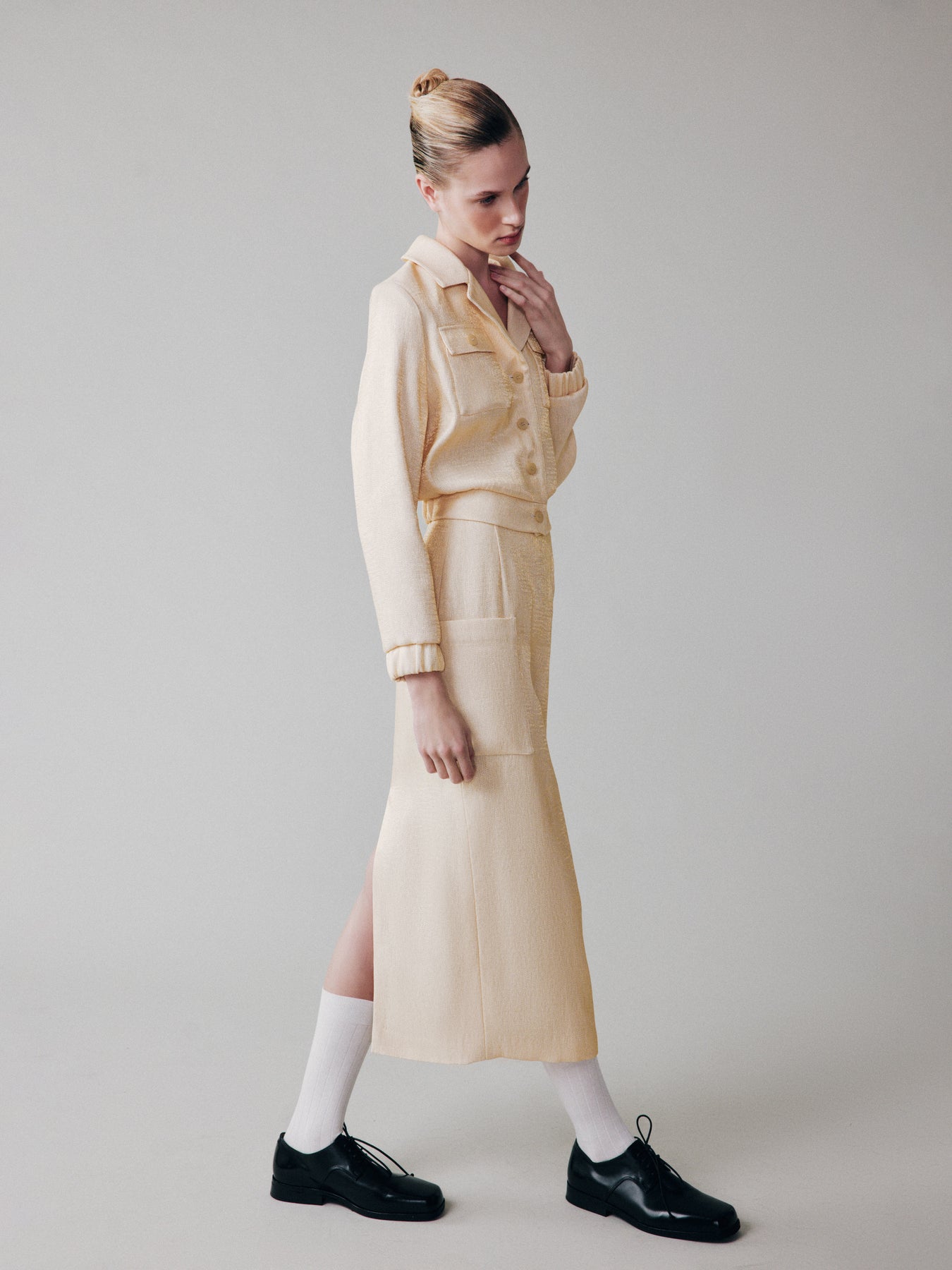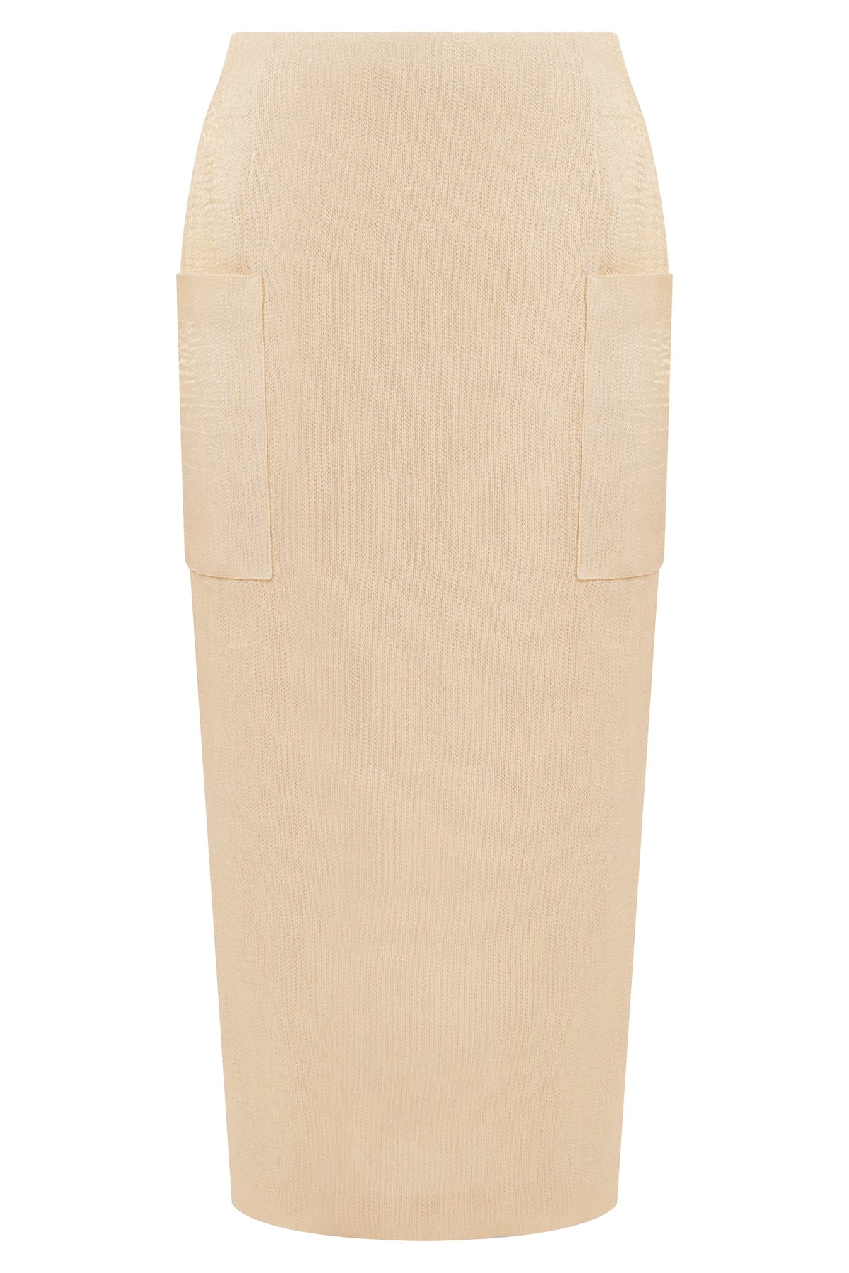 Straight-cut skirt with side patch pockets and a back slit, crafted from fabric with metallic thread.