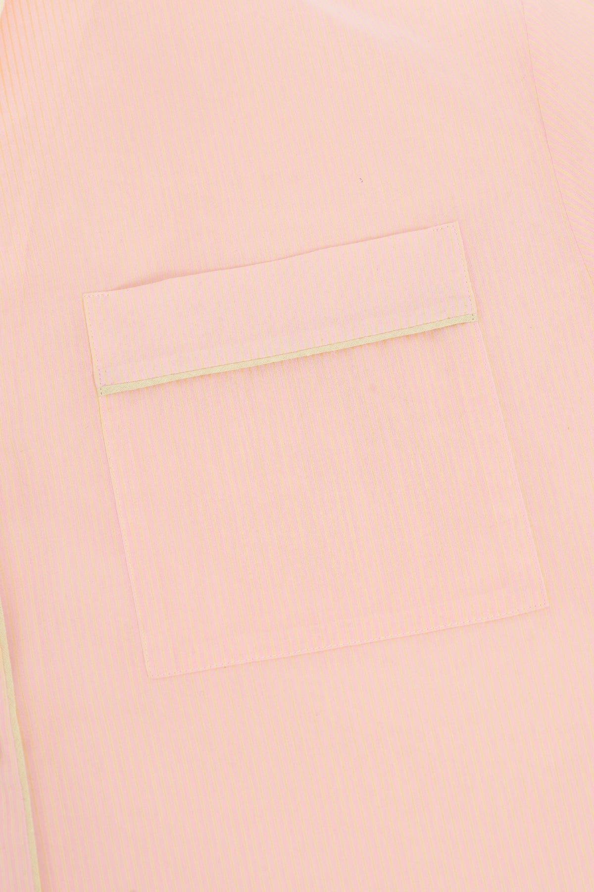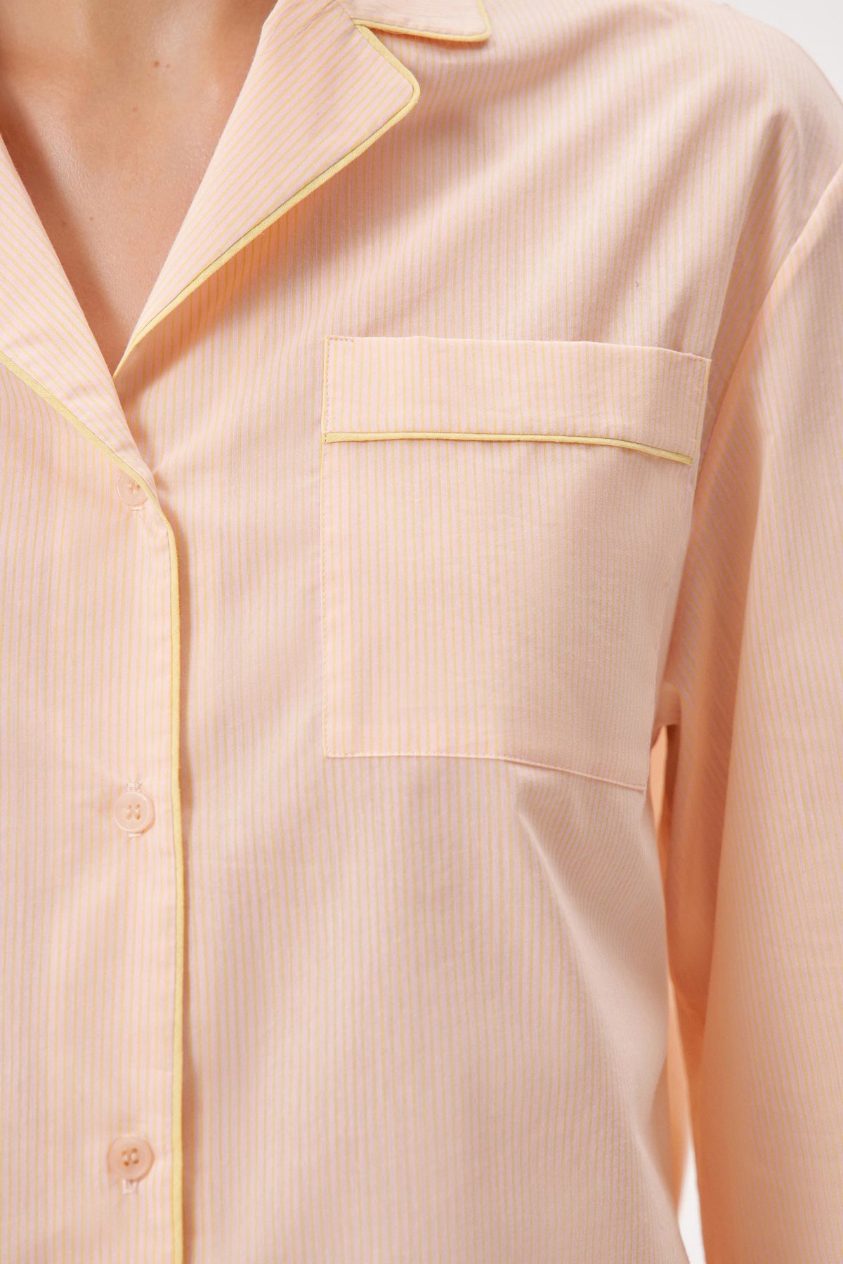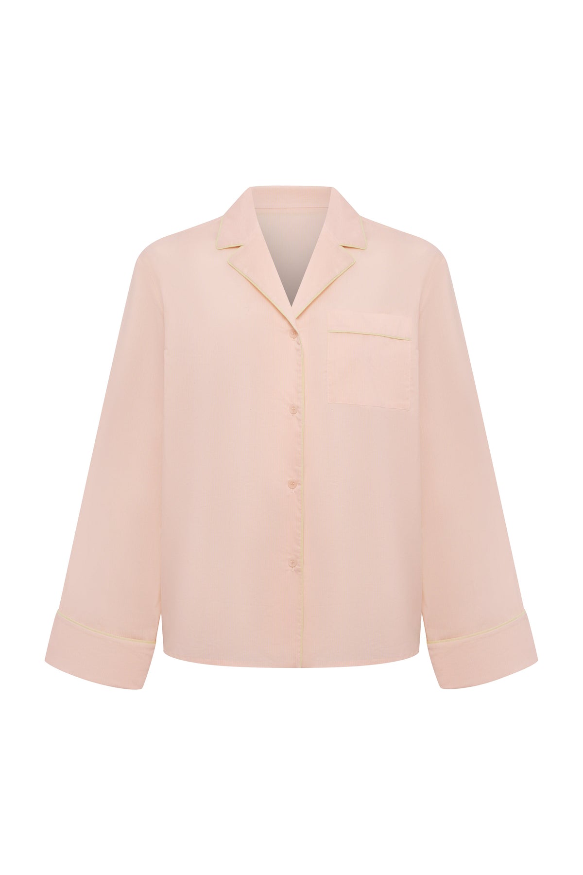 Long-sleeve pajama-style shirt made from cotton. Decorative piping along the collar, lapels, cuffs, and a pocket.